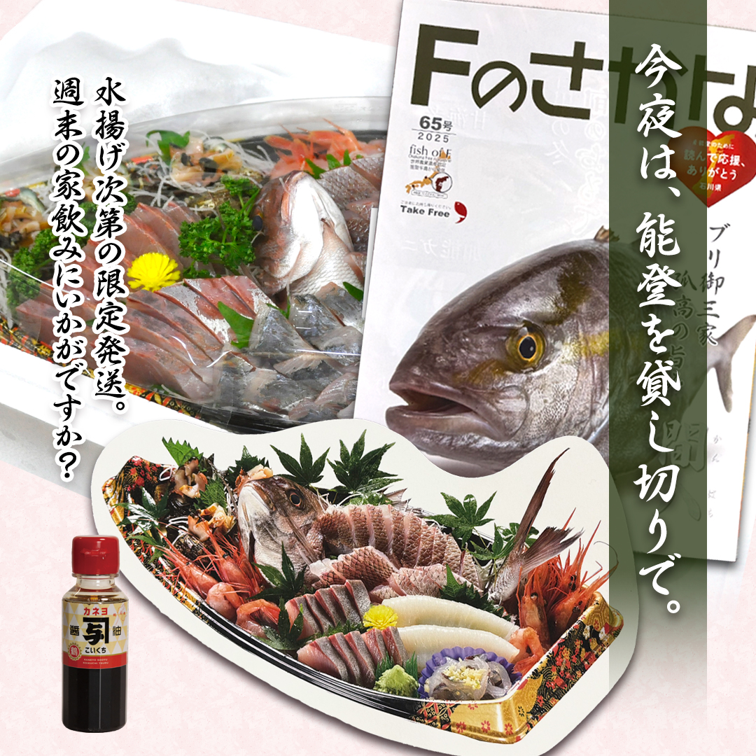 | 商品名 | さしみ舟盛りお祝い用4~5人前・能登の醤油つき【冷蔵】 | |